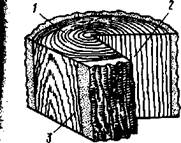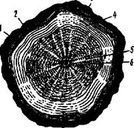 Рис. 6.1. Основные разре- Рис. 6.2. Торцевой разрез ствола: ЭЫ СТВОЛа: I — кора; 2 — луб; 3 — камбий; 4 — / - торцевой; 2 - радиальные; заболонь; 5 - ядро; 6 - сердцевина Ствол состоит из следующих структурных элементов. Кора состоит из корки и луба. Луб проводит питательные вещества от кроны в ствол и корни. Кора составляет от 6 до 25% объема дерева. Камбий, расположенный под лубом, —тонкий кольцевой слой живых клеток, способных к делению и росту; большая их часть откладывается в сторону древесины, меньшая — в- сторону луба. Древесина является основной частью ствола и находится под камбиальным слоем. По ней поднимается вода от корней в крону. Сердцевина, или сердцевинная трубка, —примерно в центре ствола вдоль его оси является рыхлой первичной малопрочной тканью. Древесина состоит из концентрически расположенных годичных слоев. Каждый годичный слой представлен ранней (весенней) и поздней (летней) древесиной. Ранняя древесина образуется весной * Включает элементы строения древесины, видимые простым глазом или при незначительном увеличении с помощью лупы. и в начале лета, поздняя — летом и в начале осени. Чередуясь, ранняя и поздняя древесина создают слоистость в строении дерева. Летняя древесина является более плотной, чем весенняя. По радиальным направлениям в виде узких полосок проходят так называемые сердцевинные лучи, чаще невидимые простым глазом; они видны у дуба, бука, клена и некоторых других пород дерева. Лиственные породы имеют водопроводящие сосуды, которые