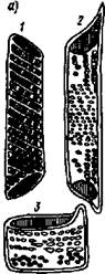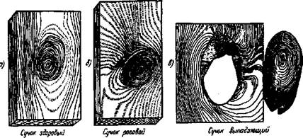Рис. 6.8. Сучки различных видов (живые и отмершие): а —сучок здоровый; б —сучок роговой; в —сучок выпадающий Ложное ядро и пятнистость характерны для растущего дерева. Но изменение окраски, сопровождаемое гнилью, наблюдается также и у срубленной древесины при ее хранении. В частности, к ним относятся химические и грибные окраски. К химическим окраскам относятся желтизна, оранжевая окраска, продубина, чернильные пятна, дубильные потеки. Все эти разновидности окраски проникают на глубину 1... 5 мм, но мало влияют на физико-механические свойства древесины, ухудшая в основном только внешний вид пиломатериалов. Грибные окраски (гнили) поражают отмирающую и мертвую древесину. На отмирающей древесине при медленном подсыхании образуется так называемая прелость вследствие поражения складскими грибами: плесень, цветной налет в 1... 2 мм глубиной, цветная заболонь, синева, коричневая или желтая окраска (в виде лимон-но-желтых пятен и полос в отличие от химической окраски), коричная окраска; эти скраски развиваются за счет содержимого