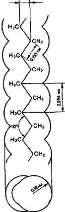 : ния не требуется сложного компрессорного зяйства. При низком давлении полиэтилен улучают полимеризацией этилена в растворе бензин) непрерывным методом при давлении 15..0, 5 МПа и температуре до 80°С в при- гтствии катализатора Циглера-Натта (комп- [ексные металлоорганические соединения). Полиэтилен низкого давления имеет зна- ; нтельные теплостойкость, плотность и жест- 1сть. Основным отличием полиэтилена низ-то давления является его кристалличность, результате чего меньшие эластичность, про-ачность и большая твердость. Будучи тер- юпластичным насыщенным полимерным углеводородом, полиэтилен имеет строение мо-декулы в виде плоского зигзага с периодом Идентичности 0, 254 (рис. 8.17). Физико-механические свойства полиэтилена в значительной мере зависят от степени (полимеризации, т. е. от молекулярной массы ■ сотового продукта. Молекулярная масса полиэтилена находится в пределах для низкого давления: 10 000...50 000 и высокого давления Що 000...400 000. Предел прочности при разрыве в зависимости от молекулярной массы полиэтилена колеблется от 18 до 25, 5 МПа, плотность |, 92 0, 95, температура плавления 110.. г125°С