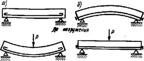 fame шпрцжешм Рис. 11.1. Работа железобетонной балки при изгибе: а—с обычной арматурой; б —с предварительно напряженной арматурой Предварительное натяжение арматуры осуществляют либо до бетонирования конструкции или изделия, либо после этого. В первом случае арматуру вначале натягивают, концы ее прочно закрепляют в бортах формы изделия, после чего приступают к бетонированию. После затвердевания уплотненной бетонной смеси арматуру освобождают от натяжного устройства. Вследствие упругости арматура стремится вернуться в прежнее ненапряженное состояние и, будучи прочно сцеплена с бетоном, обжимает его. В результате этого в железобетоне создаются взаимно уравновешивающие усилия растяжения в арматуре и сжатия в бетоне. Во втором случае арматуру располагают в каналах бетонной конструкции, ранее образованных с помощью специальных пу-стотообразователей, и натягивают ее после того, как бетон при обретает заданную прочность. Затем натянутую арматуру анке-руют на концах конструкции, а каналы замоноличивают цемент ным раствором или бетонной смесью. . Натяжение арматуры производят с помощью специальных домкратов или методом электротермического воздействия. Таким образом, сущность предварительного напряжения бетона состоит в том, что, используя силы упругого последействия натянутой арматуры (при условии ее прочного закрепления), достигается обжатие бетона в той зоне, где эксплуатационная на нагрузка может вызвать растягивающие усилия. Благодаря этому в растянутой зоне изделия должны быть вначале преодолены Емедварительно созданные сжимающие усилия и только потом [ретон начинает работать на растяжение (рис. 11.1). В преднапря-Ккенном беконе не возникают растягивающие усилия или они твстолько малы, что не превышают прочности бетона при рас-ИЬжении. К: Предварительное обжатие бетона достаточно осуществить с Иршряжением 60... 60 МПа при натяжении арматуры в пределах ■ рругих деформаций до 85...90% от предела текучести стали. HI.2. Материалы для железобетона k Для обычного сборного железобетона используют цементные бетоны классов В15 и В20 (марки М200...М300), для напряжен-Йо-армированных конструкций наиболее целесообразны бетоны классов В45 и В50 (марок М400 и М500) и выше. : ' °) 6)