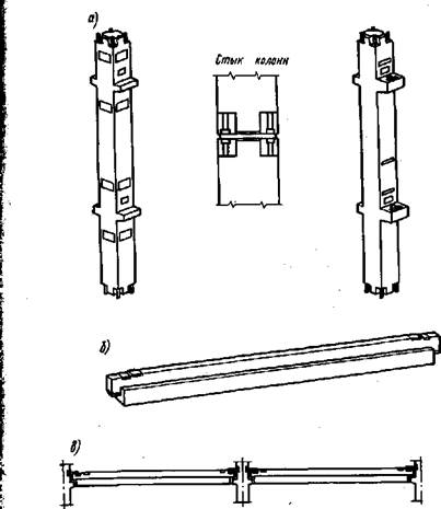 \ Рис. 11.2. Горячекатаная арматура периодического профиля (а) и сетка из S сварных стержней (б) : В качестве вяжущих веществ для предварительно напряжен-; ных бетонов применяют эффективные быстротвердеющие и особо j быстротвердеющие цементы, позволяющие значительно сократить | время тепловлажностной обработки. f Армирование железобетонных конструкций осуществляют ^стальной арматурой в виде стержней и проволоки (рис. 11.2). [Стержневая арматура может быть горячекатаной, термически! упрочненной и упрочненной в холодном состоянии. Арматурные стержни изготовляют гладкого или периодиче-I ского профиля. Периодический профиль арматуры получают при 3горячей прокатке или путем сплющивания стержней в холодном [состоянии на специальных станках. В зависимости от механических свойств горячекатаную арматуру разделяют на классы A-I, 1'А-Н, А-Ш, A-IV, A-V, AVI. Арматура может иметь специальное ^назначение классов Ат-IVc и Ат-Vc диаметром до 32 мм.!, Для армирования железобетонных конструкций применяют ^свариваемые стержни диаметром от 6 до 80 мм. Для предварительно напряженных конструкций используют также холоднока- таную высокопрочную арматурную проволоку класса В-П (угле 11.3. Железобетонные изделия и конструкции для сборного строительства Объем выпуска сборного железобетона продолжает увеличиваться, особенно предварительно напряженного. Если в 1958 г. выпуск предварительно напряженного железобетона составлял 1 млн. м3, а в 1970 г.— 17, 2 млн. м3, то в 1983 г.— свыше 28 млн. м3 в виде конструкций различного назначения, в частности большепролетных и тяжелонагружаемых. Выпуск предварительно напряженных конструкций в настоящее время составляет около 24% от объема сборного железобетона, применяемого в различных видах строительства (промышленного, жилищного, гидротехнического, сельского и ДР-). Из железобетона изготовляют практически все части зданий для сборного строительства, фундаментные плиты, блоки, фундаментные балки и другие элементы для монтажа частей зданий ниже уровня пола первого этажа; элементы каркаса зданий и междуэтажных перекрытий, стеновые панели и блоки, лестничные марши и площадки и т. д. Фундаментные плиты — массивные элементы фундамента трапецеидальной формы размерами: по длине — 80, 100, 120 см, по ширине — от 120 до 320 см при высоте 40...50 см. Плиты армируют металлической сеткой и изготовляют из бетона класса В15 (марки 150... 200). Фундаментные блоки обычно представляют собой прямоугольные параллелепипеды из бетона класса В10 (марки 150). Длина блоков может достигать 3 м при толщине 40...60 см и высоте 60 см. Блоки армируют только монтажной арматурой. В торцевой части блоков устраивают пазы, заполняемые при монтаже фундамента растворной или бетонной смесью для лучшего сцепления блоков между собой. Изделия для конструкций каркасов зданий включают: колонны, горизонтальные связи — ригели и прогоны (рис. 11.3). Их изготовляют из армированного бетона не ниже класса В15 (марок не ниже 200). Для надежной связи стоек с ригелями и прогонами в изделиях имеются закладные металлические детали со сваркой их при монтаже. Стеновые панели подразделяют на: а) панели для наружных стен неотапливаемых зданий из тяжелых и легких бетонов класса не ниже В 15 (марки не ниже 200); то же — отапливаемых зданий— однослойные из легких или ячеистых бетонов и слоистые из тяжелого бетона с теплоизоляц