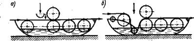 Рис. 19.2. Схема производства наплавляемого рубероида; а — способ налива; б —способ с последую ищи намазыванием РК-500-2, 0; РЧ-350-1, 0 — для верхнего слоя кровельного ковра и РМ-350-1, 0; РМ-420-1, 0; РМ-500-2, 0 —для нижних слоев кровельного ковра. В этих марках первая цифра означает массу картона (в г/м2), вторая — массу наплавляемой части мастики нижнего слоя рубероида (в кг).