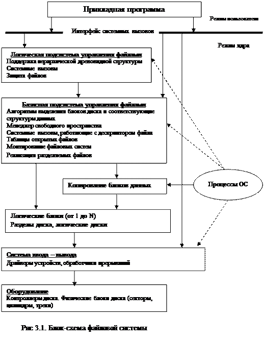 Вопросы для проверки 1. Объясните понятие раздел диска. 2. В чем смысл монтирования файловой системы? 3. Расскажите о некоторых операциях с каталогами. 4. Назовите типы защиты файлов. 5. Классификация пользователей для установления защиты. РЕАЛИЗАЦИЯ ФАЙЛОВОЙ СИСТЕМЫ Общая структура файловой системы Система хранения данных на дисках может быть структурирована следующим образом (см. рис. 3.1). Нижний уровень - оборудование. Это в первую очередь магнитные диски с подвижными головками - основные устройства внешней памяти. Магнитные диски представляют собой пакеты магнитных пластин (поверхностей), между которыми на одном рычаге двигается пакет магнитных головок. Шаг движения пакета головок является дискретным, и каждому положению пакета головок логически соответствует цилиндр магнитного диска. Цилиндры делятся на дорожки (треки). Каждая дорожка размечается на одно и то же количество блоков (секторов) таким образом, что в каждый блок можно записать по максимуму одно и то же число байтов. Для обмена с магнитным диском на уровне аппаратуры нужно указать: - номер цилиндра, - номер поверхности, - номер блока на соответствующей дорожке - число байтов, которое нужно записать или прочитать от начала этого блока. Таким образом, диски могут быть разбиты на блоки фиксированного размера и можно непосредственно получить доступ к любому блоку (организовать прямой доступ к файлам). Непосредственно с устройствами (дисками) взаимодействует часть ОС, называемая системой ввода-вывода. Система ввода-вывода предоставляет в распоряжение файловой системы - используемое дисковое пространство в виде непрерывной последовательности блоков фиксированного размера. Система ввода-вывода имеет дело с физическими блоками диска, которые характеризуются адресом, например диск 2, цилиндр 75, сектор 11. Файловая система имеет дело с логическими блоками, каждый из которых имеет номер (от 0 или 1 до N). Размер логических блоков файла совпадает или является кратным размеру физического блока диска и может быть задан равным размеру страницы виртуальной памяти, поддерживаемой аппаратурой компьютера совместно с операционной системой. В структуре системы управления файлами можно выделить базисную подсистему, которая отвечает за выделение дискового пространства конкретным файлам, и более высокоуровневую логическую подсистему, которая использует структуру дерева директорий для предоставления модулю базисной подсистемы необходимой ей информации, исходя из символического имени файла. Она также ответственна за авторизацию доступа к файлам. Стандартный запрос на открытие (open) или создание (create) файла поступает от прикладной программы к логической подсистеме. Логическая подсистема, используя структуру директорий, проверяет права доступа и вызывает базовую подсистему для получения доступа к блокам файла. После этого файл считается открытым, он содержится в таблице открытых файлов, и прикладная программа получает в свое распоряжение дескриптор (или handle в системах Microsoft) этого файла. Дескриптор файла является ссылкой на файл в таблице открытых файлов и используется в запросах прикладной программы на чтение-запись из этого файла. Запись в таблице открытых файлов указывает через систему выделения блоков диска на блоки данного файла. Если к моменту открытия файл уже испо