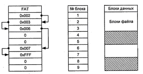 Структура: Файловая система FAT представляет собой таблицу размещения файлов, в которой указываются: 1. непосредственно адреса участков логического диска, предназначенные для размещения файлов; 2. свободные области дискового пространства; 3. дефектные области диска. В этой таблице каждому блоку, предназначенному для хранения данных, F