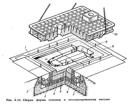 В нижнюю полуформу ставят стержни и шаблоном проверяют правильность их простановки. Затем накрывают верхней полуформой. На верх собранной формы ставят заливочную чашу под стояк, выпора для выхода газа и груз, в 5 раз превышающий вес жидкого металла. Механизация на участке