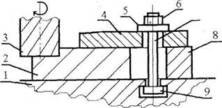 Рис. 4. Закрепление заготовок прихватом на столе фрезерного станка: 1- стол станка; 2- заготовка; 3- фреза торцевая; 4- прихват; 5- шайба; 6- гайка; 7-болт; 8- опора прихвата; 9- головка болта.