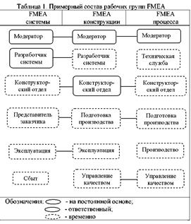 В практических условиях анализ по методу FMEA производится при групповой работе с участием сотрудников заинтересованных служб и отделов: планирования, проектного, конструкторско - технологического, производственного, управления качеством, экспериментального и др. Для эффективной работы число участников обычно не должно превышать 4-5 человек. Ответственность проведения FMEA лежит на том отделе, который непосредственно разрабатывает анализируемый объект; например, ответственность за анализ системы лежит на проектном отделе, конструкции - на представителе проектного или конструкторского отдела (разработчике рассматриваемой конструкции), процесса - производственного или технологического отделов. Желательно также приглашать представителей со стороны. При анализе действующих производственных процессов бывает также полезно объединение в группу участников, выполняющих отдельные операции. Рабочие группы могут в процессе работы расширяться для выполнения специальных задач. Каждый из участников привносит в групповую работу свои профессиональные знания и опыт в той сфере, которую охватывает служба, командировавшая его для участия в FMEA. Но для успешной работы группы бывает, необходим специалист, кото-рый может быть имеет менее глубокие знания по отдельным инженерным направлениям, по сравнению со специалистами соответствующих служб, но зато обладает опытом и знаниями в организации проведения самого анализа. Такого специалиста называют модератором. Модератор участвует в планировании проектов FMEA, подготавливает, организует, целенаправленно координирует и активизирует работу группы; оценивает и представляет результаты работы группы; информирует участников по запланированным и уже проведенным FMEA; берет на себя программное и компьютерное обеспечение. Модератор может участвовать в работе нескольких групп. Модератор обычно подчинен отделу - разработчику исследуемого объекта (рисунок 32). Как уже упоминалось ранее, ответственным исполнителем про-екта FMEA является тот отдел (специалист, представляющий его), который разрабатывает исследуемый объект. В таблице 21 приведен примерный состав групп в зависимости от вида FMEA. Таблица 21 Примерный состав
