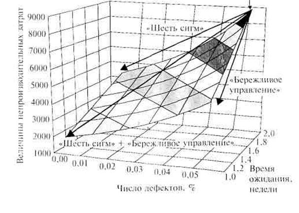 Практика использования концепции Lean Six Sigma на западных предприятиях позволяет собственными силами в короткие сроки (около года) добиться следующих результатов: • снижение себестоимости продукции и услуг на 30-60%: • сокращение времени предоставления услуг до 50%; • сокращение количества дефектной продукции примерно в 2 раза; • повышение без дополнительных затрат объема выполненных работ до 20%; • снижение стоимости проектных работ на 30—40%; • сокращение времени выполнения проектов до 70%. Графическое сравнение результатов деятельности предприятия с использованием интегрированной концепции «Шесть сигм» + «Бережливое управление» с результатами концепций «Шесть сигм» и «Бережливое управление», применяемых по отдельности, приведено на рисунке 34. Затраты на выполнение каждого из проектов примерно одинаковые.