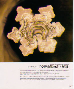 — Когда на сосуде с водой было написано «Благодарю», замерзшие кристаллы казались очень похожими на те, что были получены под влиянием известного произведения Баха " Гольдберг-Вариации". (Это произведение было написано Бахом как благодарность Гольдбергу). Мы приводим здесь также отрывки интервью с доктором Масару Емото, где он описывает некоторые детали своего исследования.