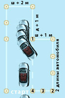 Как правильно парковаться задним ходом на площадке: 1. Подъезжаем к линии «старт», останавливаемся. 2. Трогаемся и медленно движемся вперёд. Остановившись у передней линии (примерно 30 см), включаем заднюю скорость, поворачиваем голову назад, и начинаем движение, наблюдая за правой стойкой у заднего борта автомобиля. 4. Дальнейшие действия разнятся в зависимости от автомобиля, на котором вы тренируетесь. Но сводятся к тому – чтобы подвести стойку к краю заднего колеса. Самый верный способ понять это положение – выйти из машины, поставить стойку на линии заднего края колеса, на небольшом расстоянии от машины. А затем вернуться в машину – и запомнить, как это выглядит изнутри. Так же можно проконтролировать положение стойки с помощью правого бокового зеркала. Для того, чтобы парковаться было удобно, его можно настроить ниже обычного положения. 5. Когда нужное положение достигнуто, выкручиваем руль до упора в правую сторону, при этом смотрим в ЛЕВОЕ зеркало. Как только мы увидим в левом боковом зеркале фишку номер 2 (положение показано на рисунке справа) останавливаемся. Очень важно не пропустить этот момент, иначе правильно припарковаться будет почти невозможно. 7. Теперь необходимо выровнять руль и двигаться назад. 8. Выворачиваем руль до упора влево. 9. Начинаем движение задним ходом. Смотрим на стойки перед автомобилем, и воображаем проезжую часть. Как только автомобиль расположился параллельно