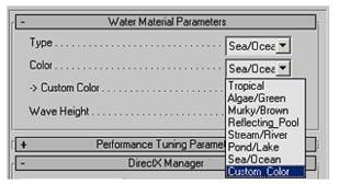 - В свитке Water Material Parameters, в разворачивающемся окне Color, выберите Custom Color.