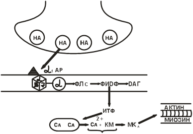 Рис. 9. М3-холинорецептор Са++ связывается с кальмодулином, активирует миозинкиназу (МК), катализирующую фосфорилирование легких цепей миозина, что приводит к сокращению клетки (рис. 9).Аналогичным образом передается импульс в синапсах секреторных желез. Норадреналин стимулирует α 1-адренорецептор, запуская следующую цепь событий: Норадреналин (НА) → α 1-адренорецептор → активирование α -субъединицы Gs-белка → активирование ФЛС → расщепление ФИДФ → увеличение концентрации ИТФ → увеличение концентрации Са2+ в клетке → Са2+связывается с кальмодулином → активируется миозинкиназа → фосфорилируются легкие цепи миозина → миозин взаимодействует с актином → развивается сокращение ГМК (рис. 10).