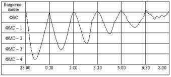 1-артериальное давление и частота сердечных сокращений; 2-частота дыхания; 3-кожногальванический рефлекс; 4-мозговой кровоток и температура кожи; 5- выработка гормона роста; ФМС – фаза медленного сна (1, 2, 3, 4 – стадии фазы); ФБС – фаза быстрого сна;