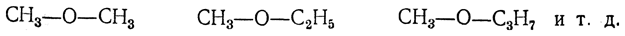 Для простых эфиров возможна такая же изомерия радикалов, какая существует для спиртов и вообще для одноатомных производных парафиновыхуглеводородов. От каждого из членов этого ряда можно, кроме того, произвести гомологический ряд, заменяя второй метил на высшие радикалы. Благодаря этому для класса простых эфиров, кроме обычной изомерии радикалов, возможна также особая изомерия, вызванная тем, что с кислородным атомом могут быть связаны радикалы различного состава. Так, эфир С2Н5—О—С2Н5 изомерен эфиру СН3—О—С3Н7, поскольку оба эфира имеют эмпирическую формулу С4Н10О. Изомерия этого рода носит название метамерии. Простые эфиры, содержащие два разных радикала, называются смешанными эфирами. Названия эфиров производятся от названий радикалов. Так, мы имеем диметиловый (метиловый) эфир, метилэтиловый эфир, диэтиловый (этиловый), метилпропиловый, метилизопропиловый эфиры и т. д.