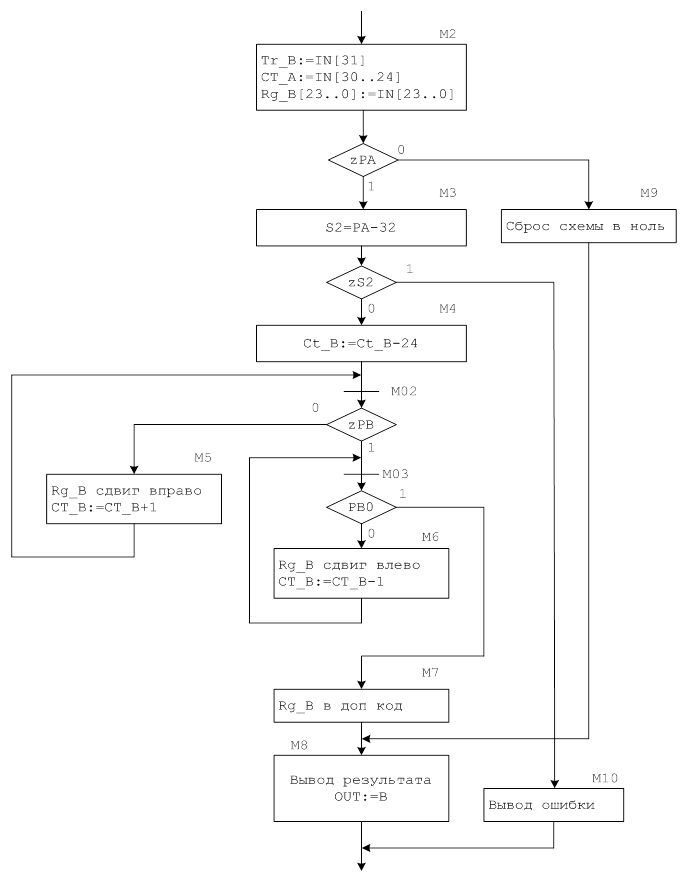 1.Сменить знак у вычитаемого. 2.Сравнить порядки чисел А и В. Ели модуль разности порядков больше 24 то результат будет А (PA> > PB) или В (PA< < PB). Если нет то: Если РА> PB, то сдвигать мантиссу числа В вправо, увеличивая порядок В на 1 при каждом сдвиге, до тех пор пока РВ не станет равно РА. 3. Перевести мантиссы в доп. код. 4. Сложить. 5. Перевести результат в прямой код 6. Нормализовать результат.