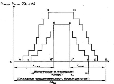 Известно, что количественно боевые действия нескольких подразделений, в первую очередь, характеризуются изменением их количества N отд, шт., на пожаре во времени. Вместе с этим они могут характеризоваться и количеством стволов, вводимых подразделениями на тушение пожара N ст, шт., или фактическим расходом огнетушащих веществ Q ф, л/с, и т.п. Наличие этих количественных характеристик и данных по классификации боевых действий одного подразделения позволяет построить обобщенную количественную модель боевых действий нескольких подразделений (рис. 4).