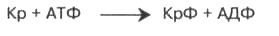 В мышечных клетках всегда имеется креатинфосфат – соединение, содержащее фосфатную группу, связанную с остатком креатина макроэргической связью. Содержание креатинфосфата в мышцах в покое -15-20 ммоль/кг. Креатинфосфат обладает большим запасом энергии и высоким сродством к АДФ. Поэтому он легко вступает во взаимодействие с молекулами АДФ, появляющимися в мышечных клетках при физической работе в результате гидролиза АТФ. В ходе этой реакции остаток фосфорной кислоты с запасом энергии переносится с креатинфосфата на молекулу АДФ с образованием креатина и АТФ: