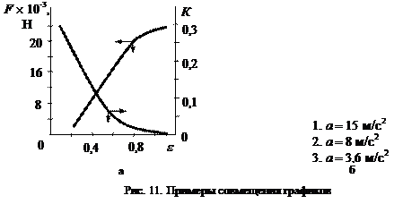 ошибок в оформлении графиков, представленных на рис. 10. Графики двух функций одного аргумента, например F (e) и K (e), можно совмещать на общей оси абсцисс. В этом случае масштабы осей ординат строят слева для одной и справа для другой функции. Принадлежность графика к одной или другой функции показывают стрелками (рис. 11а).