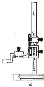 Штангенциркули выпускают следующих трёх типов: с двусторонним расположением губок для наружных и внутренних измерений и с линейкой для определения глубин (см, рис. 6.1, а) (цена деления нониуса составляет 0, 1 мм); с двусторонним расположением губок для измерения и для разметки (цена деления нониуса 0, 05 или 0, 1 мм); с односторонними губками для наружных и внутренних измерений с ценой деления нониуса 0, 05 или 0, 1 мм. Штангенрейсмусы предназначены для разметочных работ и определения высоты деталей. В мировой практике для определения высот известно применение прибора с цифровым отсчетом показаний (с ценой деления 0, 05 и 0, 01 мм). На штанге такого прибора (см. рис. 6.2, 6) нарезана зубчатая рейка, по которой перемещается зубчатое колесо ротационного фотоэлектрического счетчика импульсов, закрепленного на рамке, связанной с измерительной губкой. Величина перемещения (высота) фиксируется счетчиком с цифровым отсчетным устройством.