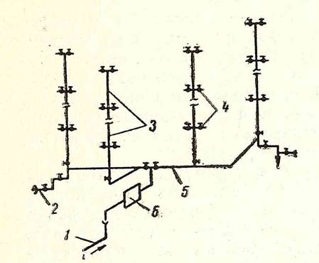 Рис. 1. Система водоснабжения здания без напорного бака и повысительной насосной установки: 1 – ввод; 2 – поливной кран; 3 – распределительные трубопроводы (стояки); 4 – подводки; 5 – магистральный трубопровод; 6 – водомерный узел. Система с напорным баком без повысительной насосной установки (рис. 2). Эта система применяется, когда гарантийный напор в наружном водопроводе в часы с наибольшим водопотреблением ниже требуемого для здания, а в другие часы суток равен или выше требуемого. В часы недостаточного напора потребители обеспечиваются водой из водонапорного бака, накапливающего воду в часы избыточного напора. Водонапорные баки (резервуары) выполняют роль запасных или регулирующих емкостей, обеспечивающих постоянство напоров (в банях, душевых павильонах и в других зданиях) и необходимый запас воды на хозяйственно-бытовые, производственные или противопожарные нужды. Система с повысительной насосной установкой без водонапорного бака (рис. 3). Эта система применяется, когда режим водопотребления в здании равномерен, а напор в наружном водопроводе постоянно или периодически ниже требуемого для здания. Если располагаемый напор в наружном водопроводе недостаточен периодически, то установка для повышения напора будет включаться только в определенные часы. Такие установки обычно автоматизируют. При неравномерном потреблении воды в течение суток для повышения экономичности работы повысительной насосной установки в систему могут быть включены баки (резервуары), которые выполняют функцию регулирующих емкостей, принимающих избыток или восполняющих недостаток воды при работе сети. При наличии бака (резервуара) повысительную несоосную установку обычно тоже автоматизируют. Вода подается насосом в домовую сеть и резервуар, а при прекращении работы повысительной насосной установки сеть снабжается водой из резервуара.