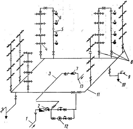 Рис. 3. Система водоснабжения здания с повысительной насосной установкой и нижней кольцевой разводкой сети: 1 – ввод № 1; 2 – обратный клапан; 3 – перемычка; 4 – запорная арматура; 5 – пожарный стояк; 6 – пожарные краны; 7 – водомерный узел; 8 – монтажные запорные вентили; 9 – поливочный кран; 10 – спуск (пробка); 11 – кольцевая магистраль; 12 – насосная установка; 13 – ввод № 2. Выбор той или иной системы водоснабжения здания или объекта производят на основе технико-экономических расчетов и технологических требований, обеспечивая надежность и бесперебойность снабжения водой потребителей.