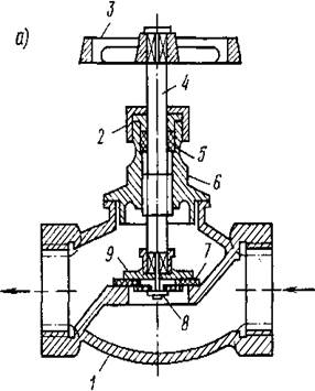 Водопроводная арматура изготовляется из латуни, стали, бронзы, серого и ковкого чугуна, пластмасс. Выбор материала определяется условиями эксплуатации и назначением арматуры. Водоразборная арматура. Относятся краны (водоразборные неповоротные, туалетные поворотные, лабораторные, банные, поливочные, писсуарные, смывные) пожарные краны, вентили и т.д. (рис. 7). В зависимости от принципа перемещения затвора водоразборную арматуру можно подразделить на два типа: вентильную и пробковую. У вентильной арматуры основной деталью является затвор (клапан), который, перемещаясь возвратно-поступательно, частично или полностью открывает или закрывает проход для воды. Основной деталью пробковой арматуры является коническая пробка с отверстием, поворотом пробки на 90° достигается открытие или закрытие крана. Запорная арматура. К ней можно отнести пробковые проходные краны (рис. 8), задвижки (рис. 9), обратные клапаны (рис. 10), запорные вентили (рис. 11), автоматически закрывающиеся клапаны, предназначенные для перекрытия отдельных участков сети и др.
