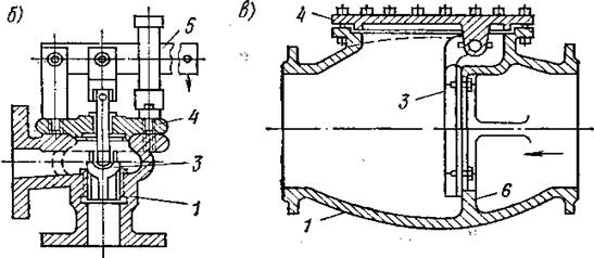 Рис. 10. Обратный клапан: 1 – седло; 2 – корпус; 3 – золотник; 4 – шток; 5 – крышка; 6 – гнездо крышки