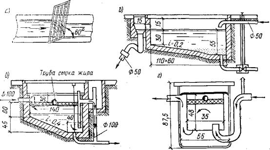 В системах внутренней канализации зданий специального назначения (гаражах, предприятиях общественного питания, банях, прачечных и т.п.) для предварительной очистки сточных вод применяют решетки, песколовки, грязеотстойники, жироуловители, бензомаслоуловители и др. Решетки (рис. 43, а) устанавливают в потоке сточной жидкости для задержания крупных загрязнений и отбросов. Применяют простые неподвижные решетки с ручной очисткой, располагая их в приемных резервуарах, колодцах и каналах. Ширину прозоров решеток принимают 10 – 15 мм и более – в зависимости от крупности задерживаемых загрязнений. Для удобства очистки решетки устанавливают наклонно к горизонту (под углом не менее 60°).