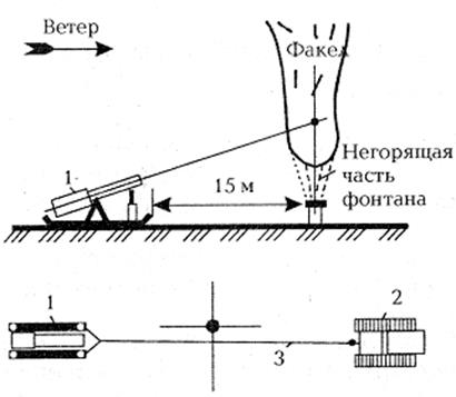 Рис. 1.14. Схема применения ППП–200 при тушении компактного фонтана: 1 – ППП–200; 2 – трактор; 3 – стальной трос.