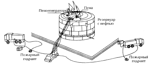Рис. 2.7. Схема подачи пены средней кратности с помощью пеноподающей техники на поверхность горящей жидкости