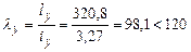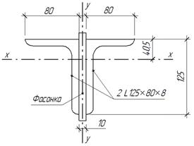 8. Принимаем в первом приближении (см. приложение 11 [3]) сечение 2 l125× 80× 8, соединенных вместе большими полками (рис.1.3): площадь сечения 9. Уточняем гибкости стержня