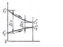 где М1, М2 – массовый расход горячей и холодной среды [кг/с]; Ср1, Ср2- массовая теплоемкость горячей и холодной среды при p=const. Теплоемкость среды выбирается по таблице для горячей и холодной среды при соответствующей средней температуре. При прямотоке характер изменения температур имеет вид: