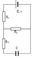 | Чему равен электрический заряд конденсатора электроемкостью С = 100 мкФ (см. рисунок), если внутреннее сопротивление источника тока r = 10 Ом, ЭДС e = 15 В, а сопротивления резисторов R1 = 70 Ом и R2 = 20 Ом?