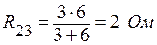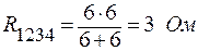 Последовательное соединение R23 и R4 заменяем сопротивлением R234: R234 = R23 + R4; R234 = 2+4 = 6 Ом. Оставшееся параллельное соединение R1 и R234 можно заменить сопротивлением R1234: