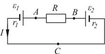 Ответ: I = 4 А. Задача 7. В схеме, изображенной на рис. 11, ε 1 = 1 В, ε 2 = 1, 3 В, r1 = 3 Ом, r2 = 5 Ом и R = 7 Ом. Найти разность потенциалов между точками А и В, В и С, С и А.