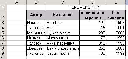 6. С помощью команды «Сортировка» отсортировать по возрастанию фамилии автора и по возрастанию количества страниц. 7.Отсортировать все книги Иванова а)выполнить команду Данные→ Фильтр→ Автофильтр, в раскрывающемся списке столбца Фамилии выбрать Иванов б) привести таблицу в исходный вид выполнив повторно команду Данные→ Фильтр→ Автофильтр 8. Отсортировать все книги с количеством страниц меньше 100 выполнить команду Данные→ Фильтр→ Автофильтр, в раскрывающемся списке столбца «Количество страниц» выбрать «Условие» в появившемся окне ввести условие < 100 9. Отсортировать все книги, год издания которых > = 2000 10. Сохранить книгу в своей папке с именем Практическа30