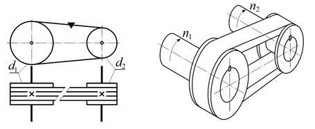 Ременная передача (рис. 1.3) осуществляется плоскими, клино-выми или круглыми ремнями через шкивы, закрепленные на ведо-мом и ведущем валах. Ремень, обхватывая шкивы, за счёт трения приводит во вращение ведомый вал.