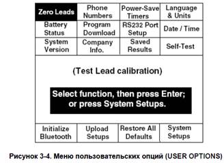 Чтобы провести калибровку прибора CopperPro, выполните следующее: 1.Нажмите кнопку Shift, затем кнопку (i), чтобы вывести на экран меню пользовательских опций USER OPTIONS (см. Рисунок 3-4). 2.Выберите пункт Zero Leads (Калибровочные провода). Нажмите кнопку (Enter) 3.Подключите тестовые провода пары 1 (Pair 1) и заземления (Ground) друг к другу, как подсказывает прибор, затем нажмите кнопку (tert) 4.Когда прибор подскажет, отключите тестовые провода, затем нажмите (tert) Если никаких сбоев не обнаружено, то на экране появится сообщение " Zero Leads Completed" о том, что калибровка прошла успешно. Если в измеренных калибровочных значениях есть отклонения, прибор выведет сообщение об ошибке с кратким описанием сути проблемы