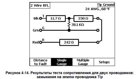 На Рисунке 4-14 показаны значения сопротивления проводника до места сбоя и от места сбоя до закорачивающей перемычки (которая на схеме показана непрерывной линией). Если до запуска теста вы указали правильное значение калибра и температуру кабеля в разделе настроек RFL Setups, то нажмите кнопку (1) (Distance to Fault) для определения расстояния до точки сбоя. Если перед тестом в разделе настроек Setups вы НЕ указали правильные значения калибра и температуры, то их можно ввести сейчас: a)Нажмите кнопку (4) (Setups), чтобы ввести одиночное значение калибра и температуру кабеля или нажмите кнопку (3) (Multiple Gauge), чтобы ввести множественные значения калибра по сегментам. b)По окончании ввода нажмите кнопку (BACK), а затем кнопку (1) (Distance to Fault) для определения расстояния до точки сбоя. На экран будут выведены достоверные расстояния, как показано на Рисунке 4-15.