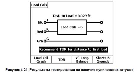 Каждый провал кривой, сопровождающийся затем пиком, соответствует одной катушке Пупина. Пара, показанная на Рисунке 4-22, содержит 6 таких провалов, сопровождающихся пиками, что соответствует шести катушкам индуктивности. Катушка, расположенная дальше всех, представлена на правой части развертки, и ей всегда будут соответствовать провалы и пики меньшего размера относительно других катушек, расположенных ближе. b) Нажмите кнопку (2) (TDR), чтобы перейти к меню рефлектометрического теста TDR, который позволит выполнить более точное измерение расстояния до первой катушки. c) Нажмите кнопку (3) (VF Long. Balance), чтобы проверить баланс в линии и убедиться в отсутствии половинных нагрузок и вызываемой ими недостаточной нагрузки. d) Если на экране появляется сообщение о резистивной ошибке " Resistive Fault', нажмите кнопку (4) (Shorts & Grounds), чтобы оценить значения сбоя.