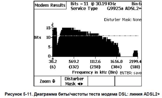 После настройки для сервисных типов Service Type Setup, подключите устройство GM/2 к тестируемой линии (для этого используется тестовый шнур DSL Test Cord, который поставляется в комплекте с устройством GM/2) и отключите от линии модем заказчика. В основном меню прибора 990 Main Menu, выберите пункт DSL Modem Test. Нажмите кнопку TEST. На экран будет выведено первое окно результатов модемного теста Modem Results, в котором будет приведена статистика работы модема на физическом уровне. Поля результатов поначалу будут пустыми, а в нижнем левом углу будет выводиться значок песочных часов, чтобы показать пользователю, что тест уже запущен и идет сбор информации. В поле Modem Status в правом верхнем углу экрана выводится статус процесса тестирования в реальном времени: ¾ подача питания - Power Up: прибор 990 подает питание устройству GM/2 (на котором загорается светодиод POWER LED, который будет продолжать гореть до отключения теста). ¾ загрузка - Booting: устройство GM/2 загружает операционную систему ¾ подключение - Connecting: устройство GM/2 отправляет предварительные сигналы, обмениваясь информацией с модемом DSLAM на дальнем конце (светодиод синхронизации устройства GM/2 SYNC LED сначала медленно мигает, затем мигает быстро). ¾ тест начался - Showtime: устройство GM/2 установило контакт с удаленным модемом DSLAM, статистика канала на физическом уровне доступна для просмотра (светодиод устройства GM/2 SYNC LED горит, не мигая). ¾ тест завершен - Test Completed: на экран выводится статистика физического уровня (светодиод устройства GM/2 SYNC LED по-прежнему горит, не мигая). Статистика физического уровня для первичного канала выводится на первой странице раздела результатов Modem Results. Нажмите кнопку More, чтобы вывести на экран вторую страницу результатов Modem Results, на которой показаны постоянно обновляемые счетчики ошибок. Нажмите функциональную кнопку Bits / Bin, и на экран будет выведена диаграмма Bits / Bin отношения битов к частоте несущей. На Рисунках 5-9, 5-10 и 5-11 показаны первое и второе окна результатов Modem Results, а также диаграмма отношения Bits / Bin для типичного теста линии ADSL2+