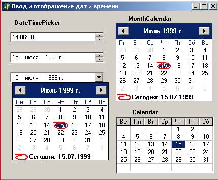 Рис. 2.2 Примеры компонентов отображения дат и времени Значение даты по умолчанию можно задать в Инспекторе Объектов через свойство Date. Это же свойство читается для определения заданной пользователем даты. При чтении Date надо учитывать тип этого свойства — TDateTime, представляющий собой число с плавающей запятой, целая часть которого содержит число дней, отсчитанное от некоторого начала календаря, а дробная часть равна части 24-часового дня, т.е. характеризует время и не относится к дате. Для 32-разрядных версий Delphi за начало календаря принята дата 12/30/1899 00 часов. В Delphi 1 за начало отсчета принят год 1, т.е. для перевода даты Delphi 1 в дату последующих версий Delphi надо вычесть из даты число 693594. Для преобразования значения свойства Date в строку можно воспользоваться функцией DateToStr. Например, оператор Memol.Lines.Add('Дата: ' + DateToStr (DateTimePicker1.Date));добавит в окно Memo1 строку вида «Дата: 01.12.98». При вводе дат можно задать значения свойств MaxDate и MinDate, определяющих соответственно максимальную и минимальную дату, которую может задать пользователь. В режиме ввода времени dtkTime введенное пользователем значение можно найти в свойстве Time, тип которого — тот же рассмотренный выше TDateTime. Преобразовать время в строку можно функцией TimeToStr. Компонент MonthCalendar похож на компонент DateTimePicker, работающий в режиме ввода дат. Правда, в компоненте MonthCalendar предусмотрены некоторые дополнительные возможности: можно допустить множественный выбор дат в некотором диапазоне (свойство MultiSelect), можно указывать в календаре номера недель с начала года (свойство WeekNumbers), перестраивать календарь, задавая первый день каждой недели (свойство FirstDayOfWeek) и т.п. Для некоторых офисных приложений все это достаточно удобно.
