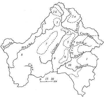 Возвышенности: 1 – Среднерусская; 2 – Смоленская: а) Дятьковская, б) Асельская; 3 – Дубровская; 4 – Вщижская; 5 – Брянская; 6 – Трубчевская; 7 – Стародубская. Низменности: 8 – Ипутьская; 9 – Судостьская; 10 – Деснинская. Смоленская возвышенность долинами рек Десны и Болвы подразделена на Рогнединскую, Дятьковскую и Жиздринскую возвышенности. Смоленская возвышенность южной окраиной занимает междуречье рек Десны и Угры, а в пределах области – Остра-Десны, Десны-Болвы и Болвы-Рессеты-Жиздры. Преобладают отметки в 200–220 м, севернее у г. Спас-Деменска (Калужская область) до 280 м. Водораздельные участки занимают плоские и пологоволнистые равнины, нередко заболоченные. Однако, в отличие от Среднерусской возвышенности, часто встречается холмистый, грядовый и котловинный рельеф, с крупными озерами. Между реками Сеща и Габья тянется Асельская гряда с отметками 250–292 м. Среднерусская возвышенность, занимающая восточную окраину территории области, долинами рек Снежети, Навли, Неруссы и Сева подразделена на Карачевскую, Навлинскую, Брасовскую, Комаричскую и Севскую возвышенности. Они представляют как бы «отроги» единой Среднерусской возвышенности, ограниченной на западе долинами рек Десны и Рессеты и расположенной между ними Пальцовской ложбиной. Среднерусская возвышенность на восточной границе области имеет отметки до 274 м. Её водораздельная часть представляет плоскую или пологоволнистую равнину, вдоль долин рек глубоко и густо расчленённую балками и оврагами. Западный склон возвышенности осложнен террасовыми ступенями и нечетко выраженными уступами. Тыловые части ступеней нередко заболочены. Между долинами рек тянутся широкие плоские субмеридиональные ложбины. Нередко они пересекают и основной водораздел между бассейнами рек Десны и Оки на отметках 200–220 м. На ступенях, особенно средних и нижних, поверхность осложнена микрозападинами и воронками, а на нижних террасах массивами бугристого и грядового рельефа, известного под названием «Севских» и «Брянских» песков. Приднепровская низменность, северная периферия которой чаще именуемая Полесской или Деснинско-Припятьской низменной равниной, широкими «заливами» вклинивается к северу по долинам крупных рек. В пределах области они образуют Деснинскую, Судостьскую и Ипутьскую низменности. Их разделяют небольшие «островные» Стародубская и Брянская возвышенности. Стародубская возвышенность с отметками до 230 м не имеет чётких границ. Плоские и пологоволнистые водораздельные равнины чередуются с плоскими широкими заболоченными ложбинами. Только по западному склону встречаются участки холмистого и холмисто-грядового рельефа. Повсеместно распространены западины, нередки карстовые воронки. Брянская возвышенность тянется по правобережью р. Десны от пгт. Дубровки до г. Трубчевска, её абсолютная высота снижается с 288 м южнее п. Дубровка, до 212 м у г. Трубчевска, а относительная высота над урезом р. Десны составляет 70–90 м. Долинами малых рек и сквозными ложбинами она подразделяется на Дубровскую (288 м), Вщижскую (228 м), Брянскую (234 м) и Трубчевскую (212 м) островные возвышенности. Границы между возвышенностями и низменностями топографы на картах проводят обычно по изогипсе 200 м. Для низких платформенных равнин, в том числе и для Восточно-Европейской, имеющей среднюю высоту 142 м, это «влечет з