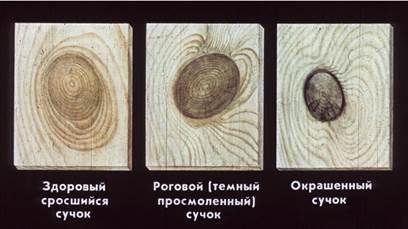 Сучки – части ветвей, заключенные в древесине. Они нарушают однородность строения древесины, вызывают искривления волокон и затрудняют механическую обработку. Сучки подразделяются на здоровые и пораженные гнилью (рис. 4). В последнем случае древесину нельзя применять для ответственных деревянных конструкций, так как такие сучки не только понижают механические свойства древесины, но и могут явиться источником распространения грибковой инфекции. Здоровые сучки по степени срастания делят на сросшиеся, частично сросшиеся, несросшиеся и выпадающие. Трещины – это разрывы древесины вдоль волокон. Они нарушают ее целостность, снижают механическую прочность и долговечность. Метиковые трещины имеют радиальное направление в ядре и заболони и отходят от сердцевины. Они возникают в растущем дереве и увеличиваются в срубе при его высыхании. Различают простые и сложные метиковые трещины. Простые состоят из одной-двух расположенных на обеих сторонах бревна и лежащих в одной плоскости трещин. Сложный метик состоит из одной или нескольких трещин, расположенных на торцах бревна и лежащих в разных плоскостях.