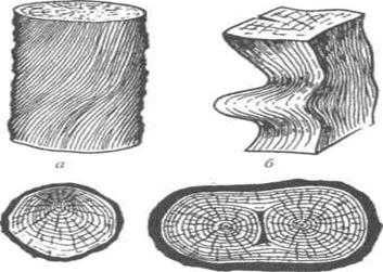 Завиток – порок, характеризующийся местным искривлением годичных слоев. Завиток понижает прочность древесины, в частности, при сжатии вдоль волокон и при изгибе. Косослой – порок древесины, характеризующийся винтообразным, косым расположением волокон в стволе. Прочность древесины, в частности при сжатии вдоль волокон, заметно понижается при отклонении направления волокон от оси ствола более чем на 5 см на 1 м длины. Косослой повышает усушку и коробление древесины. Свилеватость – порок, выражающийся в волнистом и путаном расположении древесных волокон. Свилеватость понижает прочность древесины при изгибе, но повышает сопротивление сжатию и раскалыванию. Крень – изменение строения древесины, когда годовые кольца имеют разную толщину и плотность по разные стороны от сердцевины. Крень нарушает однородность древесины. Двойная сердцевина. Наличие в стволе двойной сердцевины снижает ценность древесины и ее качества. Она имеет вид двух систем концентрических слоев древесины при общей системе годовых слоев на периферии ствола, который в этом месте в поперечном сечении имеет обычно не круглую, а овальную форму. Этот порок затрудняет переработку (особенно распиловку и лущение) древесины и повышает количество отходов. Древесина, окружающая двойную сердцевину, приобретает повышенную склонность к растрескиванию. Разновидности данных пороков изображены на рис. 6.
