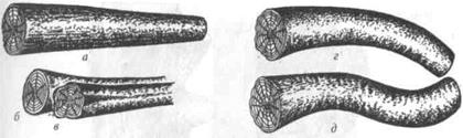 Рис. 6. Пороки строения древесины: а –косослой; б –свилеватость; в –крень; г –двойная сердцевина Сбежистость – порок, характеризующийся уменьшением диаметра ствола от комля к вершине более чем на 2 см на 1 м длины ствола. Сбежистость понижает выход пиломатериалов, а в некоторых случаях и сортность древесины вследствие образования искусственного косослоя. Закомелистость – резкое увеличение диаметра комлевой (нижней) части ствола. Закомелистость бывает округлой и ребристой. В любом случае она увеличивает количество отходов и искусственно вызывает косослой в готовой продукции. Кривизна ствола – искривление ствола дерева в одном или нескольких местах. Сильная кривизна переводит древесину в разряд непригодной для строительных целей. Пороки формы ствола дерева изображены на рис 7. Дефектами древесины называют пороки механического происхождения, возникающие в процессе заготовки, транспортировки, сортировки, штабелирования и обработки.