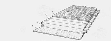 Рис. 12. Паркетная доска: 1 – нижний компенсационный слой шпона; 2 – паз; 3 – несущая доска, склеенная из брусков; 4 – лицевой слой из твердых пород Паркетные доски состоят из верхнего лицевого слоя износостойкой древесины, наклеенной на основание реек. Размер досок от 120 до 300 см по длине и от 15 до 20 см по ширине. Лицевая поверхность делается из планок твердолиственных пород (дуба, бука). Она шлифуется и покрывается лаком. Основание изготовляют из неделовой древесины. Паркетные доски изготавливают двухслойными и трехслойными. В двухслойных нижний слой – основание состоит из фрезерованных брусков или досок, лицевое покрытие – верхний слой – из прямоугольных одинаковых планок. Оба слоя между собой прочно склеены водостойкими клеями на основе синтетических смол. В нижнем слое паркетной доски с одной длинной и одной короткой кромками сделан паз, а с противоположных кромок – гребень, с помощью которых доски соединяются между собой. Трехслойные паркетные доски состоят из верхнего лицевого слоя из строганного шпона толщиной от 3 до 6 мм. Средний слой выполняют, как правило, из сосновых реек толщиной от 5 до 15 мм, шириной до 40 мм. Нижний слой – основание – изготовляют из елового или соснового шпона толщиной 2-2, 5 мм (рис. 12). Все слои склеены между собой водостойким синтетическим клеем. Паркетные доски, как и обычные дощатые полы, укладываются по лагам на деревянных балках или по песчаной засыпке на железобетонных перекрытиях, которая одновременно служит и хорошей звукоизоляцией. Паркетные дощечки и квадры шпона наклеивают на основание в соответствии с заданным рисунком. Паркетные доски после укладки в пол не нуждаются в дальнейшей обработке (циклевании, шлифовке), на них только наносится прозрачное лаковое или другое покрытие. Паркетные щиты или щитовой паркет. Паркетные щиты различных конструкций и размеров изготавливаются так же, как и паркетные доски. Этот вид паркета, как и выше рассмотренный, не слишком трудоемок при укладке и экономичен. Щиты состоят из лицевого слоя и основания. Лицевой слой делают обычно из узких планок древесины твердолиственных пород, а нередко и из древесных отходов, а основание – из древесины хвойных пород, ДСП и фанеры. Верхнее лицевое покрытие представляет собой паркетные планки одинаковой ширины с прямыми фрезерованными кромками и наклеенные на основание в виде квадратных элементов, расположенных в шахматном порядке. Квадратный элемент представляет собой набор планок, плотно уложенных кромка к кромке (рис. 13). Сторона квадрата принимается равной длине планки.
