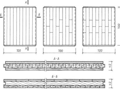 Рис. 13. Паркетные щиты – возможные конструкции и размеры Мозаичный (наборный) паркет. Паркет мозаичный – одно из наиболее распространенных паркетных покрытий в РФ и за рубежом. Этот тип паркета, благодаря простоте изготовления, индустриальности, экономичности и художественным качествам служит весьма прогрессивным материалом для отделки чистых полов. Он представляет из себя паркетные планки прямоугольной формы, собранные в ковер квадратной формы (40х40 и 60х60 см). Планки набирают в щиток рисунком в виде прямого квадрата с взаимно перпендикулярным расположением квадратов (по направлению волокон древесины). Мозаичный паркет требует хорошо выровненного основания (стяжки) и планок одинаковой толщины. Он настилается на цементно-песчаной стяжке с помощью водо- и биостойких клеев. Размеры планок позволяют изготовлять их из отходов древесины и тем самым экономить деловую древесину. В эстетическом отношении этот вид паркета позволяет архитекторам разнообразить композиции рисунка пола, увязать его с архитектурой интерьера. Благодаря небольшому размеру планок можно получить большое художественное разнообразие решений, укладывая планки в плетенку, в елку, в шашку, а также используя древесину различных цветовых оттенков [18]. Паркет штучный – наиболее традиционное высококачественное и дорогостоящее покрытие пола. Он состоит из планок прямоугольной формы, на кромках которых имеется паз или гребень для взаимного сопряжения при настиле. Лицевая плоскость планок калибрована так, чтобы при их соединении создавалась гладкая поверхность, которую затем пришлифовывают, циклюют и покрывают специальным паркетным лаком. В зависимости от профиля кромки паркетные планки подразделяют на два вида: с гребнями и пазами на противоположных кромках и торцах (с правыми и левыми сторонами); с гребнем на одной кромке и пазами на другой кромке и торцах. Основанием под чистый пол могут служить деревянные, ксилолитовые, бетонные и другие виды покрытий. К деревянному и ксилолитовому основанию планки крепятся гвоздями, а к другим видам – синтетическими клеями и мастиками. Штучный паркет не отвечает требованиям индустриальности производства, трудоемок в изготовлении и укладке. Кроме того, на него расходуется больше ценных сортов древесины, чем на другие виды паркетных полов. Тем не менее, он включен в номенклатуру, так как применяется в тех районах страны, где не налажен выпуск более прогрессивных видов паркетных покрытий. Еще одна разновидность паркетного покрытия – художественныйпаркет – нестандартное изделие. Его изготовляют в заводских условиях по специальным чертежам в виде щитов, имеющих квадратную или прямоугольную форму. В качестве основания используют рамку из брусков древесины хвойных пород толщиной 55–65 и шириной 110 мм. Верхний, лицевой слой паркета выполняют из древесины ценных пород, преимущественно лиственных. Наряду с широко применяемыми для изготовления штучного паркета древесными породами используется древесина груши, яблони, вишни, черешни, ореха, можжевельника, кипариса. Чтобы получить красивый яркий рисунок, используют древесину красного дерева (махагони), черного эбенового дерева, лимонного дерева, розового амаранта и др. Рисунок художественного паркета может быть самым разнообразным: сочетание различных геометрических