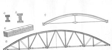 Рис. 16. Виды изделий из клееной древесины: а, б – двутавровые балки; в – блок из досок; г – клееная арка из полуарок; д – клееная ферма