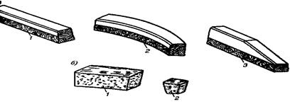 К ним относятся профилированные детали (ступени, дверные порталы, оконные обрамления, карнизы, обрамления колонн), изделия для дорожного строительства (бортовой камень, брусчатка, шашка для мощения). Ступени и лестничные площадки подвергаются наибольшему разрушающему воздействию, поэтому для них самым подходящим материалом являются силикатные породы с плотностью более 2500 кг/м3. Из этих пород наиболее длительное время сопротивляются истиранию камни, имеющие в своем составе кварц. Это – гранит и кварцит. Самыми употребляемыми для ступеней являются средне- и мелкозернистые породы: гранит, габбро, сиенит, диорит, базальт, песчаник. По условиям службы ступени должны иметь шероховатую поверхность. При такой фактуре слабо выявляются декоративные достоинства камня, поэтому для ступеней камень подбирают исходя, прежде всего, из его сопротивления истиранию, прочности и морозостойкости. Такие элементы зданий, как порталы дверей, обрамления окон, карнизы и колонны обычно изготовляют из железобетона с облицовкой тонкими плитками природного камня. По декоративным качествам наибольшие требования предъявляются к колоннам и порталам дверей, находящимся в наибольшей близости к наблюдателю; по прочности – к карнизам, капителям и базам колонн, подвергающимся чаще, чем другие элементы здания, механическим воздействиям. Для порталов и баз колонн используют гранит, габбро, лабрадорит и другие силикатные высокопрочные породы, придавая облицовке тонкую фактуру. Для карнизов, обрамления окон и облицовки стволов колонн можно также использовать известняк, мрамор, песчаник, травертин. В дорожном строительстве из природного камня изготовляют бортовые и мостильные камни, брусчатку, тротуарные плиты (рис. 33). Бортовые камни, отделяющие проезжую часть дороги от тротуара, изготовляют из плотных изверженных пород (гранита, диабаза и т.п.), отличающихся высокой морозо- и износостойкостью и прочностью. Бортовые камни бывают прямые и лекальные, высокие – до 40 см и низкие – до 30 см. Брусчатка имеет форму бруска, слегка суживающегося книзу. Представляет собой колотые или тесаные бруски высотой 10–16, шириной 12–15 и длиной 150–250 мм, близкие по форме к параллелепипеду. Брусчатку изготовляют из однородных мелко- и среднезернистых пород (диабаза и др.). Из таких же пород изготовляют шашку для мозаиковой мостовой.